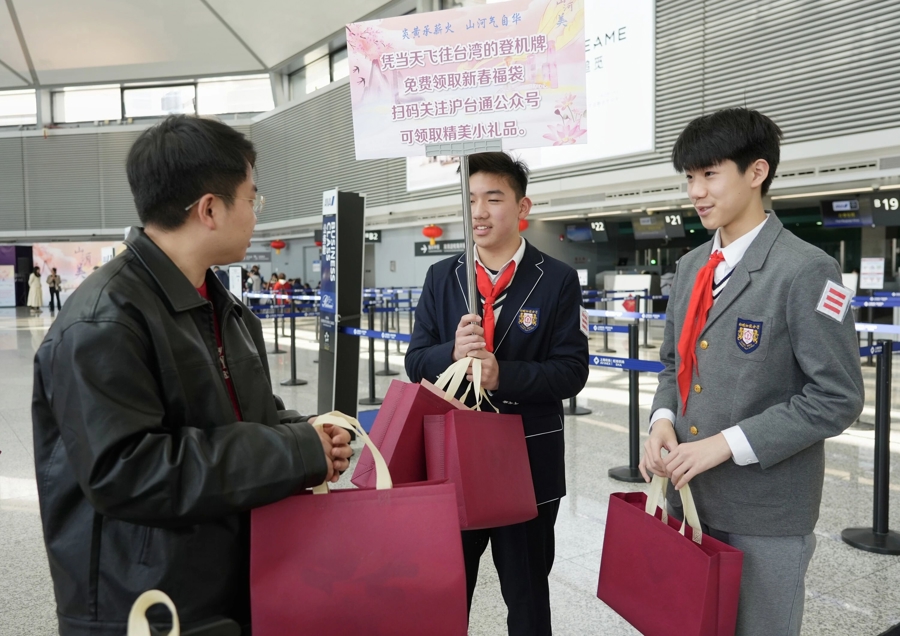 新春送福,活动现场设置专属摊位,凭当天飞往台湾的登机牌,可免费领取福字或对联;现场旅客扫码关注沪台通公众号或参与打卡,可领取小礼品。